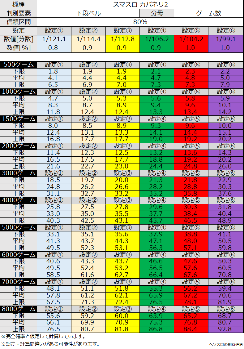 ・下段ベル20回(設定⑥平均値)は全ての設定の頼区間内であるため、いずれの設定も否定できない。