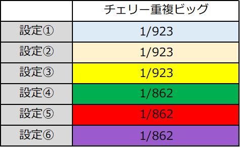 ネオアイムジャグラーEXのチェリー重複ビッグ確率には設定差があり設定①で1/923、設定⑥で1/862と高設定が優遇されています。
