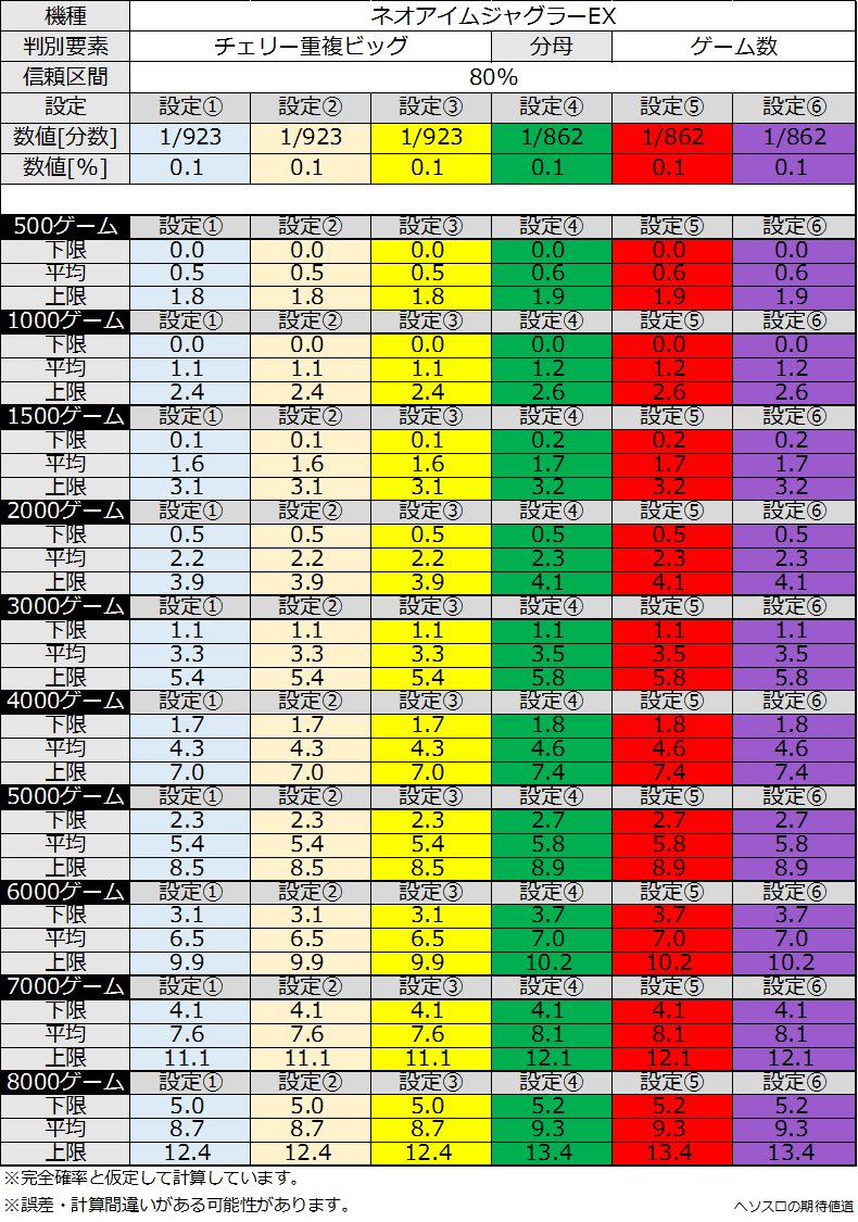 ネオアイムジャグラーEXのチェリー重複ビッグの設定差がこちら。