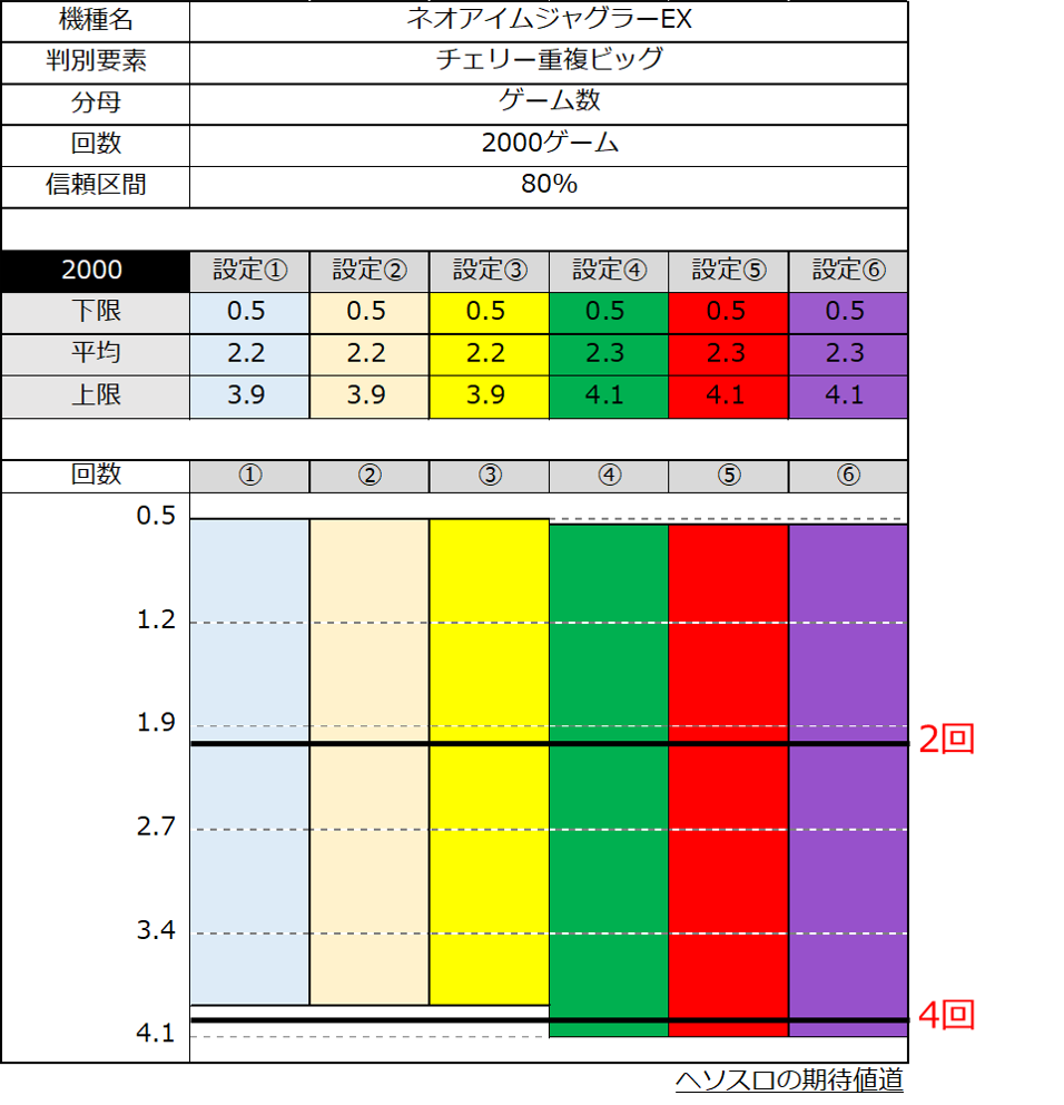 ・チェリー重複ビッグ2回(設定⑥平均値)は全ての設定の信頼区間内であるため、いずれの設定も否定できない。