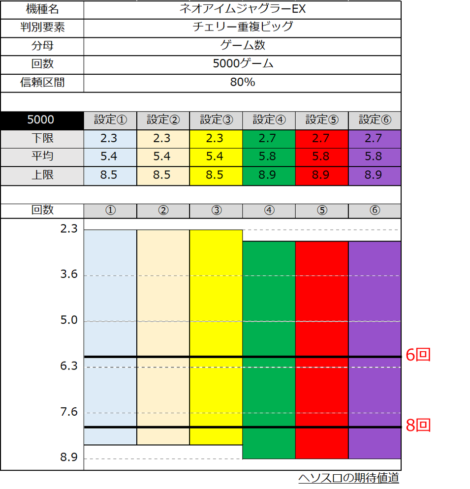 ・チェリー重複ビッグ6回(設定⑥平均値)は全ての設定の信頼区間内であるため、いずれの設定も否定できない。