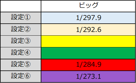 スマスロHANABIのビッグ確率には設定差があり設定①で1/297.9、設定⑥で1/273.1と高設定が若干ですが優遇されています。