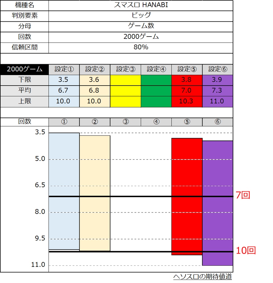 ・ビッグ7回(設定⑥平均値)は全ての設定の信頼区間内であるため、いずれの設定も否定できない。