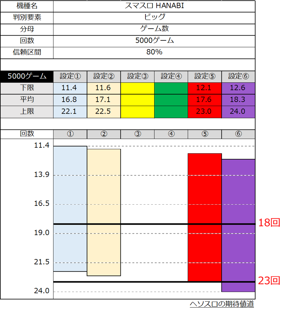 ・ビッグ18回(設定⑥平均値)は全ての設定の信頼区間内であるため、いずれの設定も否定できない。