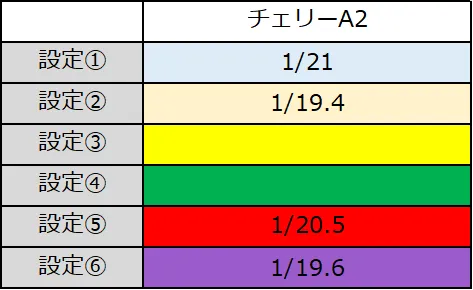 スマスロHANABIのチェリーA2確率には設定差があり設定①で1/21、設定②で1/19.4と偶数設定が優遇されています。