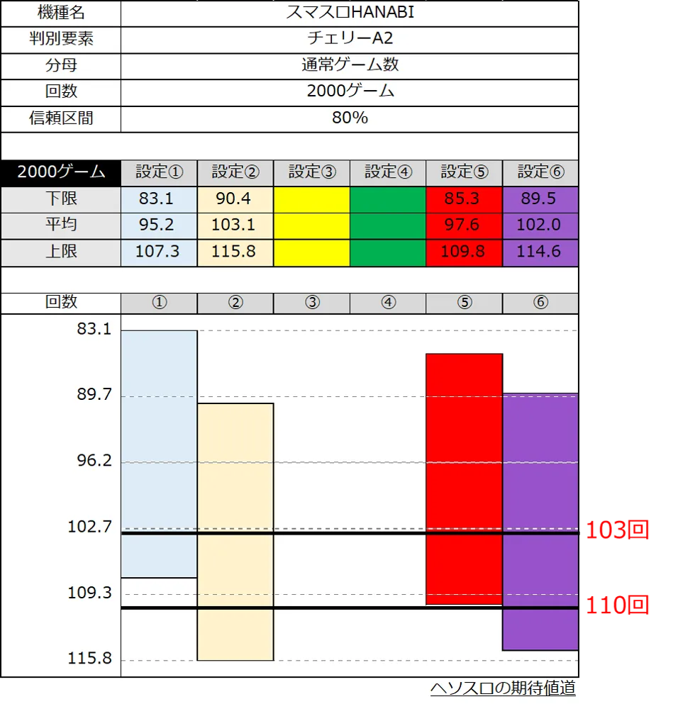・チェリーA2 110回は設定①⑤の信頼区間上限を超えるため、設定②⑥以上に大きく期待。