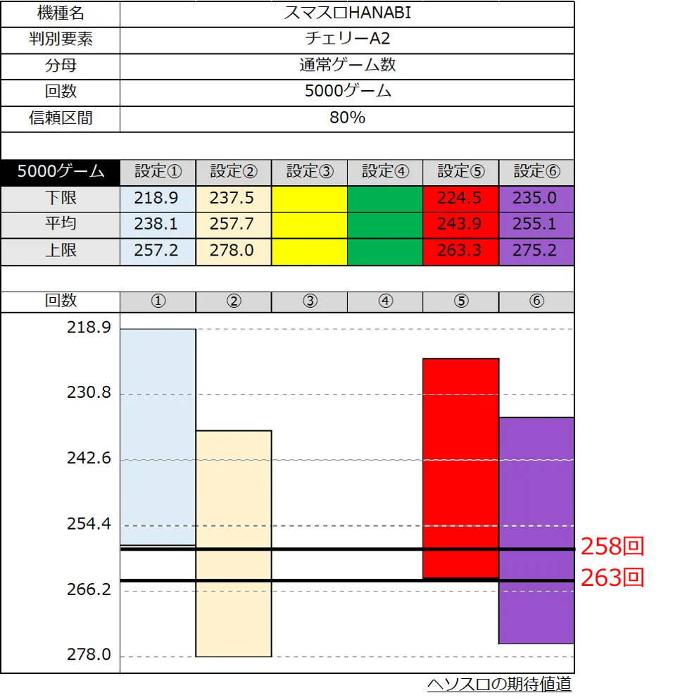 ・チェリーA2 263回は設定①⑤の信頼区間上限を超えるため、設定②⑥以上に大きく期待。