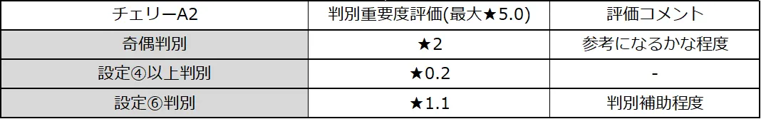 「ゲーム数」に対する「チェリーA2」回数をカウントして、設定推測に活用してみてください。