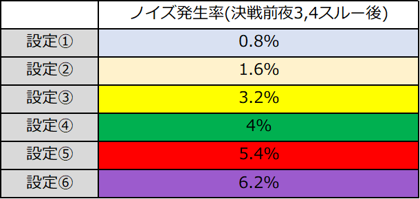特に設定差が大きいのが決戦前夜3スルー、4スルー後で上記のテーブルのような設定差があり、設定①で0.8%、設定⑥で6.2%となっています。